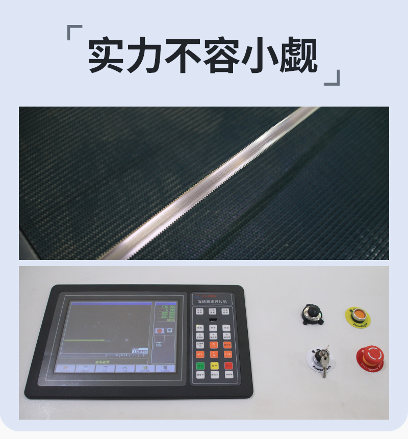 1.海綿高速切片機為循環(huán)刀,具備強大的切割能力,可實現(xiàn)高效切片任務并可以無縫對接其它設備實現(xiàn)自動流水線作業(yè)。